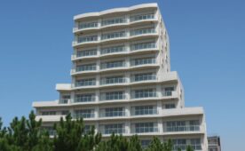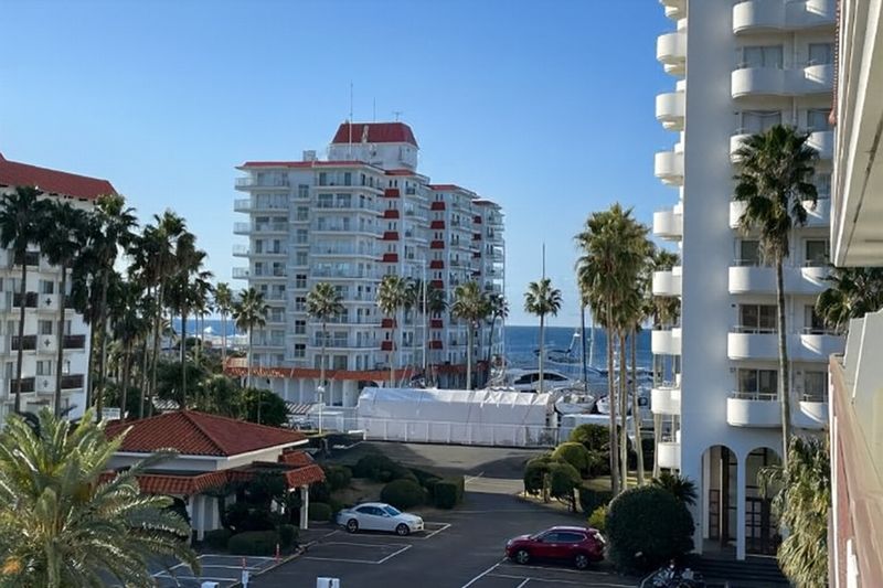 浜辺へと続く小径を抜けて、その先にゆったりと佇む13階建ての白壁…