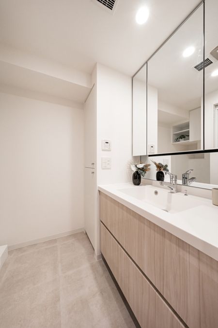 空間に美しく溶け込むスタイリッシュなデザインの洗面化粧台。